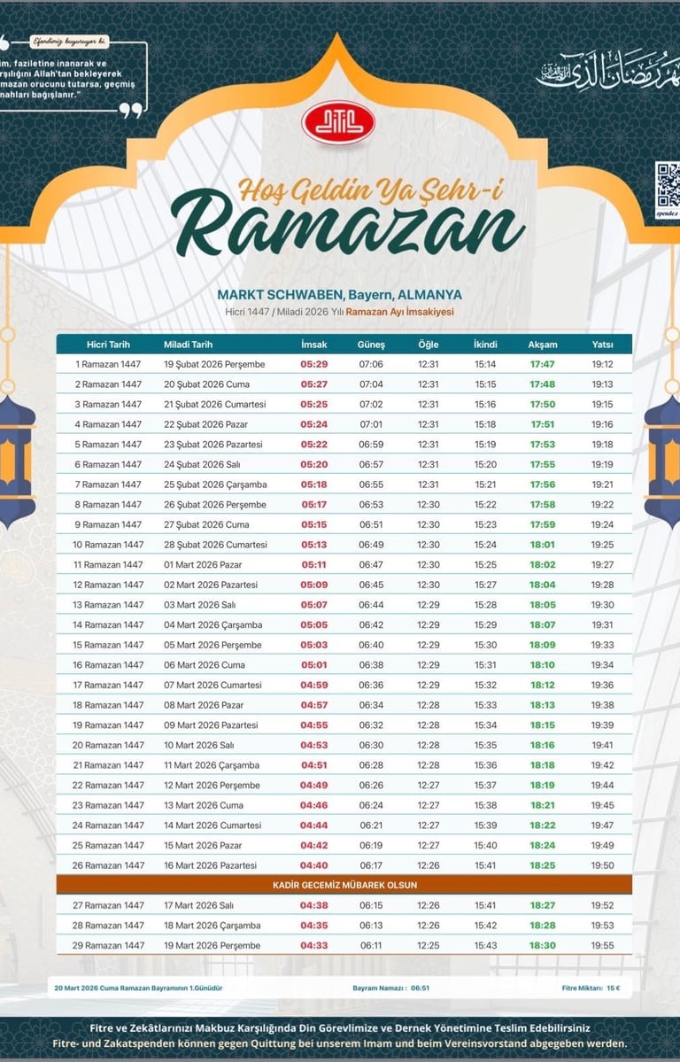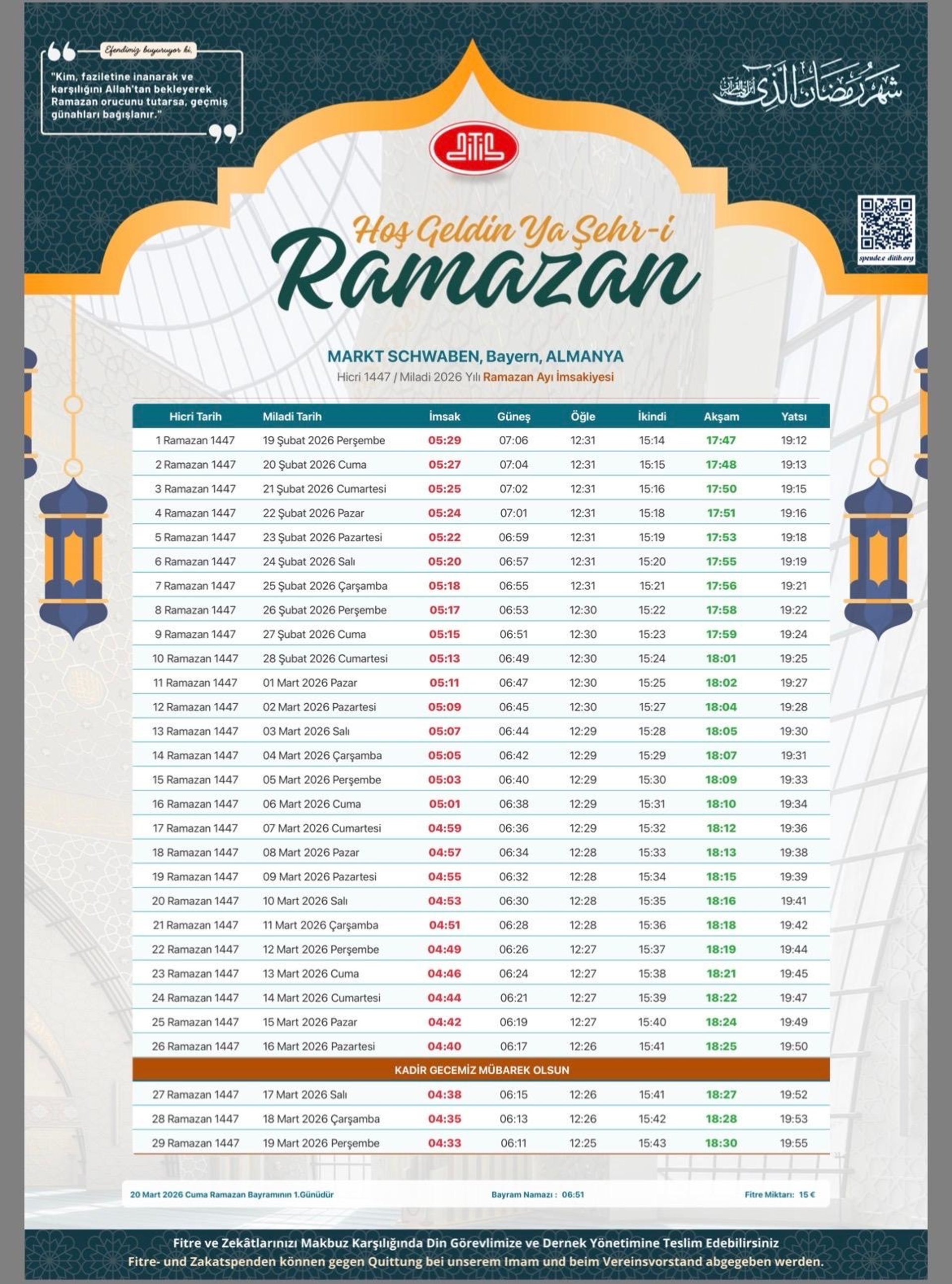 Wir laden alle Gläubigen zu unseren täglichen Gebeten in der Moschee ein. Tägliche Gebetszeiten: https://namazvakitleri.diyanet.gov.tr/de-DE/